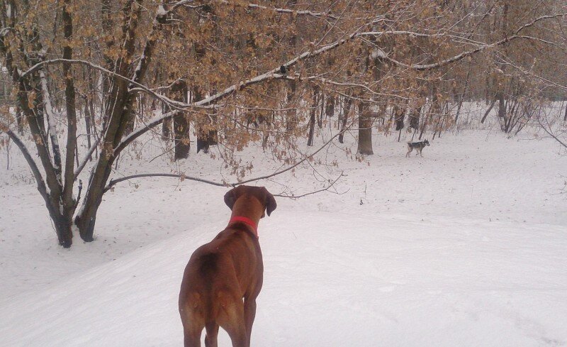...Итак, гуляем. Золка на горку - и ворона на горку. Золка с горки - и ворона за ней. Золка на горку - и тут эта идиллия была нарушена третьим лицом. Точнее, мордой.