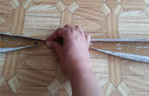 Прежде чем сваривать швы нужно зафиксировать края линолеума на основании пола. Для этого используйте 2-х сторонний скотч. Плотно лежащие друг к другу полосы ПВХ-покрытия хорошо прижмите к двустороннему скотчу.