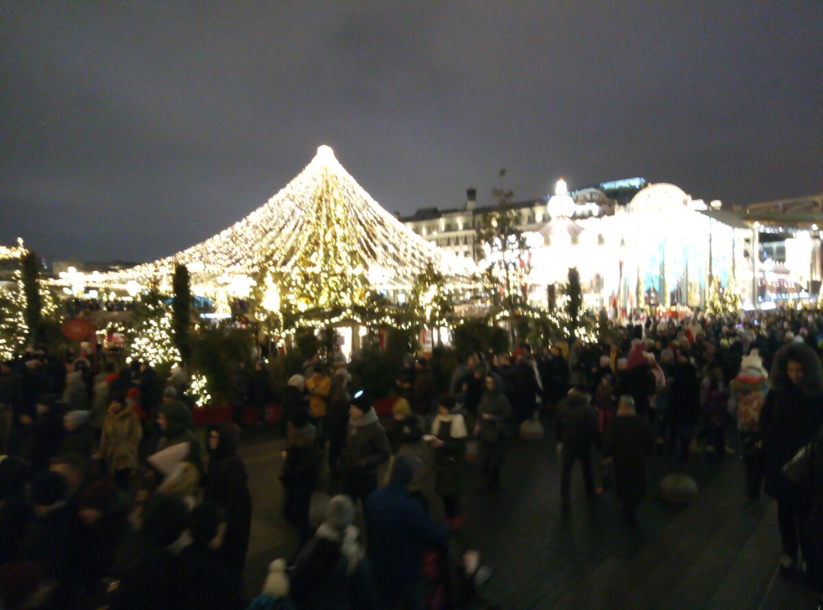 Всем привет, дорогие друзья. Сейчас мы находимся в Москве, сегодня, правда уже поедем домой. А вот вчера к вечеру мы решили отправиться на Красную площадь, посмотреть, как она выглядит на Рождество. Конечно, Красная площадь - место популярное. Там и не в праздники всегда было много народу. А в Рождество там вообще было не протиснуться. Чтобы попасть на Красную площадь, необходимо было пройти через турникеты. А перед этими самым турникетами была такая толпа, что стоять в ней у нас не было ни малейшего желания. Мы решили вернуться обратно в метро. Лучше уж мы погуляем где нибудь поближе к тому месту, где мы снимаем отель. Там тоже есть интересные места, а вот народу там намного меньше. В центре Москвы, кстати, красиво все украсили. Мы немного погуляли возле Красной площади. Но на саму неё мы не пошли. Но все таки, красочной новогодней иллюминацией мы полюбовались. И там действительно красиво. Вот только народу бы чуть поменьше было. Повсюду продавались сувениры. Цены на них, конечн