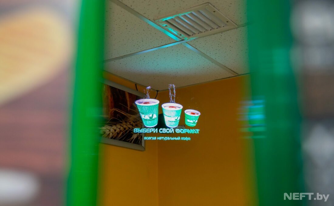 Автор: Виолетта ДРАЛЮК Лучше один раз увидеть – «живая» реклама появилась в сети АЗС «Белоруснефти» В сети автозаправочных станций компании «Белоруснефть» появилась «живая» реклама. Виртуальный контент первыми осваивают на АЗС № 20 по улице Хатаевича в Гомеле. Самые популярные вкусные предложения общепита АЗС теперь представлены не только в обычном виде за стеклом кулинарной витрины автозаправки, но и «парящими» в воздухе в 3D-формате. Достаточно переступить порог торгового зала и приблизиться к кассам, чтобы увидеть, как материализуются твистер, хот-дог, кофе, пребывая в постоянном движении. Аппетитный визуальный ряд сменяет объемный логотип «Белоруснефти», новогодней елочки… Пока изображений шесть, но это только начало. Чем интересна и привлекательна голография, NEFT.by рассказал Андрей Ровда, ведущий специалист по маркетингу РУП «Белоруснефть-Гомельоблнефтепродукт». Благодаря светодиодам, расположенным на лопастях голографического вентилятора, создается эффект объемного изображения.