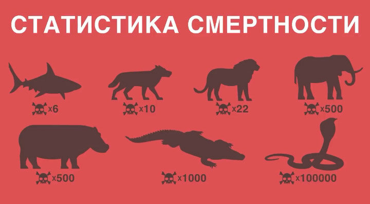 Акулы провоцируют всего 6 смертей в год. Их плохая репутация сильно преувеличена. Волки ответственны всего за 10 смертей в год. Львы убивают 22 человека в год.