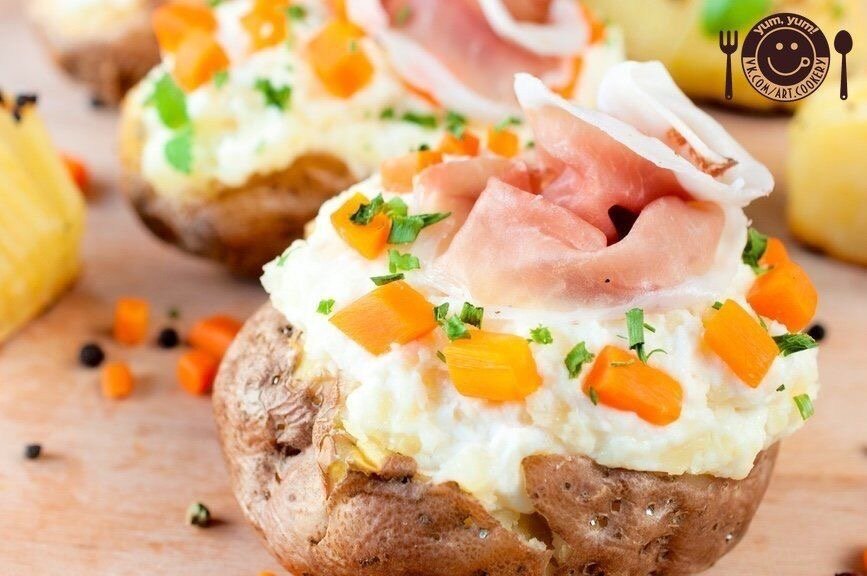 Чем фаршировать картошку: три вкусные идеи 1. Фаршированный картофель с ветчиной и сыром Вкусный фаршированный картофель с начинкой из сливочного сыра, чеснока и прошутто. Ингредиенты: Крупный картофель — 2 шт. Сливочное масло — 50 г Чеснок — 1–2 дольки Сливочный сыр — 200 г Прошутто — 4 ломтика Вареная морковь — для украшения Зелень — для украшения Соль — по вкусу Сливки — 2 ст. л. Приготовление: 1. Картофель помыть, вытереть полотенцем и плотно завернуть в 4–5 слоев фольги. Подготовленные клубни выложить на противень и поместить в разогретую до 180 ºC в духовку. Запекать 1,5 часа (в зависимости от размера клубней). 2. Горячий картофель вынуть из духовки. Не разворачивая фольгу, разрезать вдоль посередине острым ножом. Половинки развернуть. Пока картофель горячий, аккуратно отделить картофельную мякоть от кожуры. Слегка перемешать прямо в картофельных чашечках. На каждую половинку выложить по кусочку сливочного масла, посолить. Взбить картофельную мякоть с маслом до образования