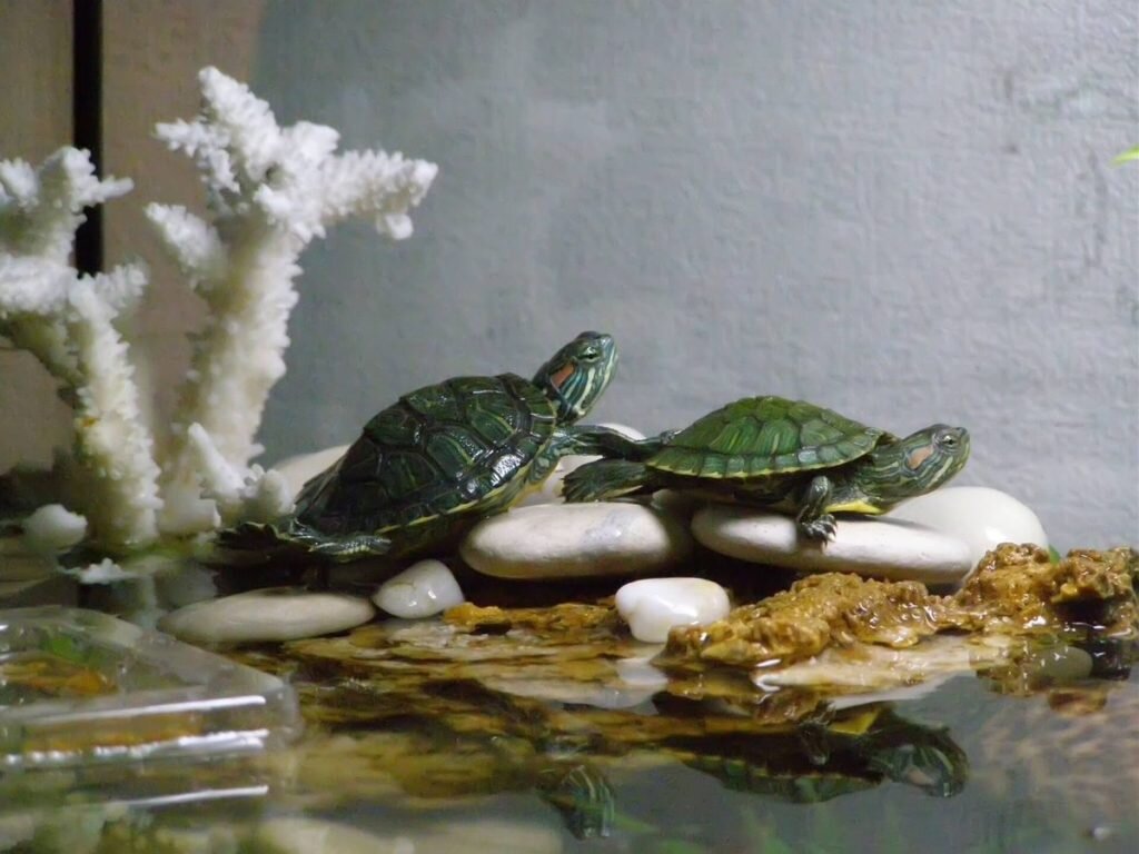 Гравий и гладкая галька отлично подойдут для грунта, еще можно использовать коврики. Они имитируют травяное покрытие. Также вы можете поместить в террариум несколько больших гладких камней, керамические изделия и коряги для украшения. Температура воды должна быть от 17 до 30 градусов.