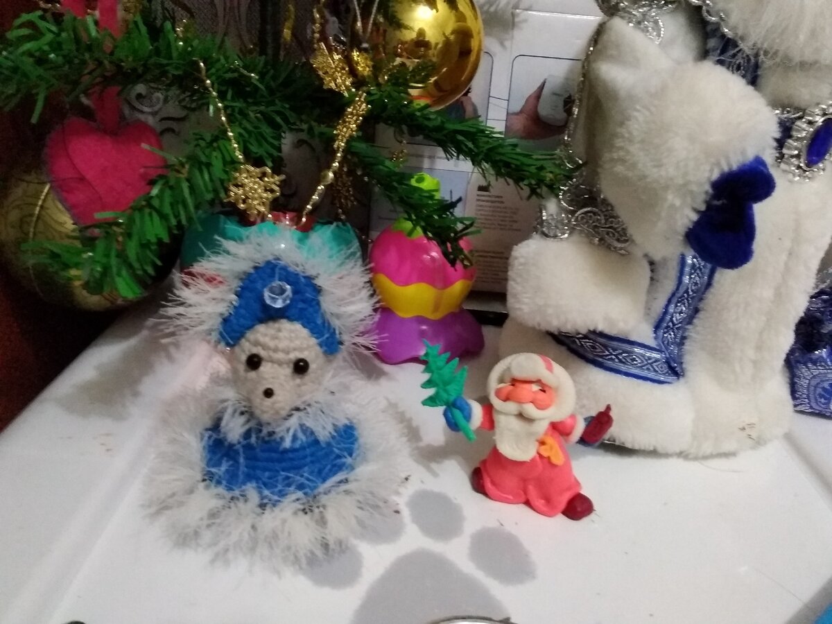 Пока еще актуально, хочу показать вязаную мышку в образе Снегурочки. Связана по МК Stefi, который можно встретить в свободном доступе. Посмотреть его может любой желающий, а с меня – фото и небольшие пояснения)) и да, я намеренно связала ее без ушек, потому что ребенок собирается подвесить бусины к низу кокошника и они не влезают. Материалом вязания выбрала карачаевскую пряжу – она для меня более удобна, поскольку хорошо держит форму и не проваливается, а цветов у нее очень много. Синяя пряжа для шубки и кокошника, светло-кофейная для мордочки мышки, бело-черная «Травка» – для опушения. В мастер-классе автора пряжа другая. Для украшения пригодились бусинки от игрушек, глазки вставные кукольные, носик сперва хотела вышить, но потом решила взять детальку-глазик другого диаметра. В процессе все выглядело вот так. Вязать такую мышку крючком 1,6 мм, можно взять 2,5 мм. Мне кажется, для вязания можно взять любую пряжу, в составе которой есть хлопок. Она делает вязание плотнее, важно еще п
