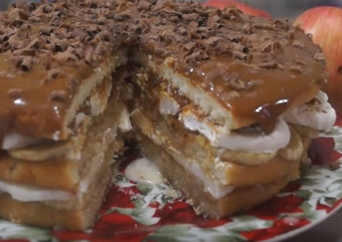 Иногда просто катастрофически не хватает времени на десерт. В этом случае такой рецепт придет вам на помощь. Ингредиенты Как приготовить 1)Для начала все подготовим, на режим банан, зефир кружочками. 2)Берем готовые бисквитные коржи, смазываем сгущенным молоком, сверху выкладываем слой бананов, затем зефир, смазываем сгущенным молоком. 3)Сверху укладываем еще корж 4)Проделываем все тоже самое. 5)Верхний корж смазываем варенным сгущенным молоком, посыпаем тертым шоколадом. 6)Дадим тортику постоять, хотя бы 1 час, а если ждать не когда, то можно сразу побывать). 7)Дадим тортику постоять, хотя бы 1 час, а если ждать не когда, то можно сразу побывать). Приятного аппетита!