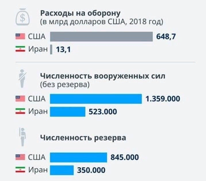 В сети были обнародованы данные вооруженных сил Ирана и США. Мы провели сравнение, чтобы понять, какой расклад сил будет на случай начала войны между США и Ираном. Что можно сказать? США на несколько голов выше подготовлена к надвигающемуся конфликту. Расходы, численность - всем этим в Штатах занимались лучше, нежели в Иране. Поразительные цифры можно видеть в расходах на оборону. Видимо, Иран так сильно в себе уверен, что обороняться не будет. Однако это ещё не всё. Посмотрите далее: Единственным, чем может похвастаться Иран, это количество артиллерии. Но так ли сильно она важна при таком колоссальном превосходстве соперника? Посмотрим, как поможет Россия в этом конфликте, ведь вставать на сторону США Россия не будет. Остаётся ждать развития всей истории. Пишите своё мнение в комментариях.