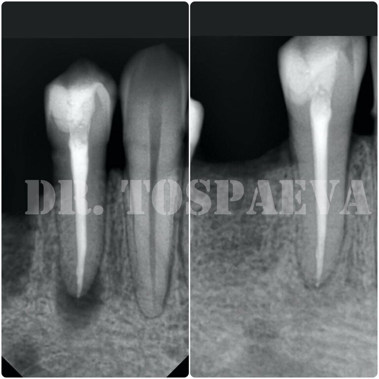 Некачественное лечение корневых каналов или отсутствие лечения часто приводит к возникновению воспаления в костной ткани вокруг причинного зуба. Многие называют это воспаление «кистой», что не вполне корректно. На рентгеновском снимке мы видим тёмный очаг с чёткими краями – это и есть вышеописанное воспаление («киста»). Это реакция костной ткани на инфекцию, которая находится в канале. На деле это соединительнотканное (мягкое) разрастание на верхушке зуба, в месте, где должна быть кость. Не следует бояться и хвататься за голову, если у вас обнаружили такую проблему. Такие зубы очень часто поддаются лечению, удалять их не нужно, нужно только попасть к грамотному врачу. Как было описано выше, появление «кисты» обусловлено защитной реакцией организма на инфекцию в корневом канале. Следовательно, корневой канал надо повторно (или первично в случае, если зуб ранее не был лечен) обработать механическим способом и с помощью сильных антисептиков. Зачастую этого достаточно для полного заживлен