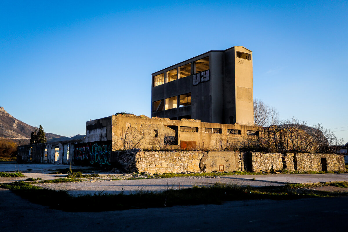 На одном из пляжей Черногории стоит заброшенный производственный комплекс, который облюбовали художники стрит-арта. Уже на подходе к зданию видно, что над его внешним видом старались не один день. Фасад украшен необычным рисунком и как бы говорит, что внутри есть что то интересное. Но как обычно бывает на таких заброшенных объектах, все что представляло какую то ценность в прошлом уже давно унесено. Фактор близости населенных пунктов и одного их популярных пляжей Черногории играет важную роль. Я быстренько пробежался по этажам заброса. С первого взгляда кажется, что раньше комплекс так или иначе был связан с какими то зерновыми культурами. Подобные строения мне часто встречались в России. Конусообразные конструкции обычно служат в таких помещениях для отгрузки или сортировки зерновых культур. Но я могу и ошибаться, так как достоверной информации о объекте на просторах интернета я не нашел. Хорошо видно, что все металлические конструкции были спилены. Из-за этого в полу бетонной кон