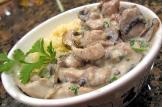Ингредиенты: Куриные грудки — 2 шт. Шампиньоны — 400 г Сливки 22% — 300 мл Специи — по вкусу Масло сливочное — 40 г. Приготовление: 1. Шампиньоны моем и нарезаем крупными дольками. В сковороде разогреваем немного сливочного масла, кладем туда наши грибы и обжариваем на среднем огне около 5 минут. Пока грибы жарятся - курицу нарезаем на небольшие кусочки, размером примерно 2 на 3 см. 2. Когда грибы размякнут и выпустят сок, добавляем в сковороду курицу. Если надо, немножко добавляем масла. 3. Когда кусочки курицы побелеют - заливаем все содержимое сковороды сливками, добавляем соль и специи, сбавляем огонь и тушим около 5 минут. Когда соус обретет нужную густоту - тогда и снимаем с огня, поскольку грибы и курица уже, по сути, готовы. 4. Подавать блюдо можно с любым гарниром - рисом, макаронами (как у меня на фото) или картофелем. Приятного аппетита!😘🍛🍴