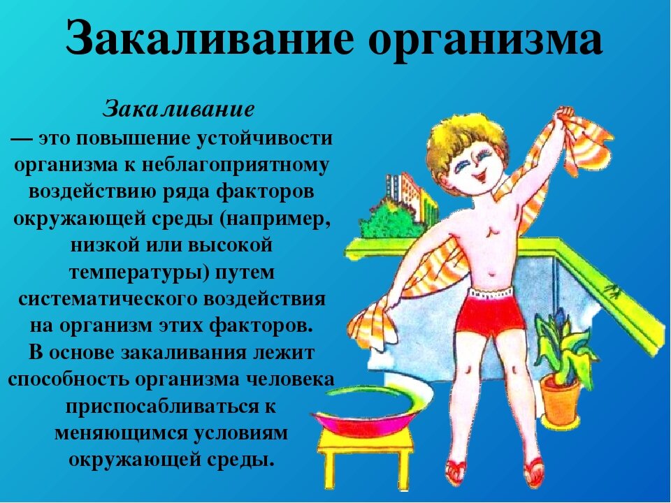 Закаливание – это система профилактических мероприятий, направленных на сопротивляемость организма неблагоприятным факторам окружающей среды. Оздоровительное закаливание помогает организму повысить адаптацию к условиям внешней среды. То есть закаленный организм даже при значительных колебаниях температуры окружающей среды поддерживает температуру внутренних органов в достаточно узких границах. Например: при резком снижении или повышении температуры внешней среды закаленный организм резко отреагирует сужением или расширением сосудов на угрозу возможного сильного охлаждения либо перегрева, и ограничит или повысит теплоотдачу. Тогда как незакаленный организм не сможет так быстро отреагировать, и получит переохлаждение или перегрев. Кроме этого закаливание человека повышает выносливость организма, укрепляет нервную систему, повышает иммунитет и сопротивляемость болезням. Закаливание считают одним из лучших способов сохранить здоровье.