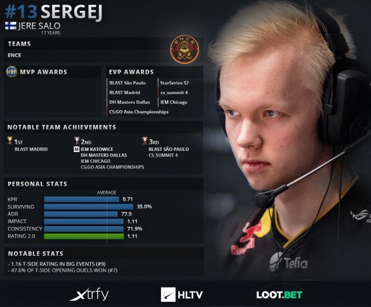 Впечатляющие результаты в пером полугодии и плотный график эвентов позволили Йере "sergej" Сало занять 13-е место в списке 20 лучших игроков 2019 года составленного при поддержке Xtrfy и LOOT.BET.