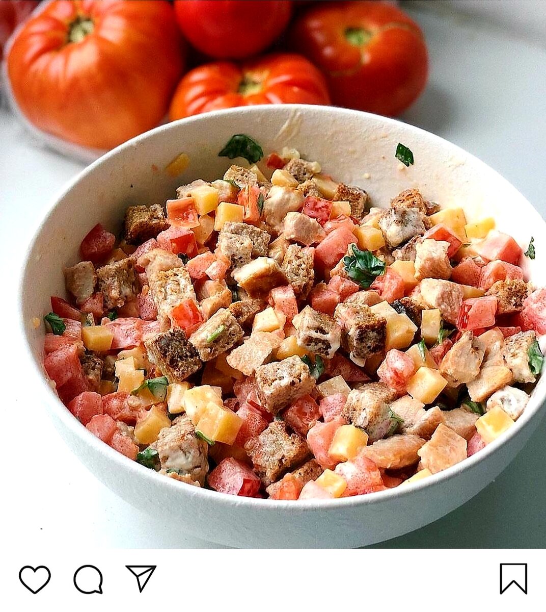 Ингридиенты : Для заправки: Столовую ложку сметаны смешать с горошинкой горчицей и чайной ложкой соевого соуса. Приготовление : Обжариваем грудку до румяной корочки,нарезаем крупным кубиком сыр и помидор. Подсушиваем хлеб на, скоровороде, натмраем чесноком-это будут наши сухарики. Зелень мелко порубить, сделать заправку и все хорошенько перемешать . Приятного аппетита 😘