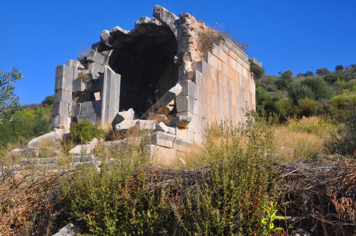 Тур по античным городам Средиземноморского побережья Турции Идем по дороге к берегу моря. Тут и там попадаются руины руины temple tomb – храма-усыпальницы Если хотите заморочится и заняться переводом, то пожалуйста Вскоре прошли шлагбаум. Заплатили за вход 15 лир Фотографируем базилику (basilika) фотографируем Бани Гавани (Harbor Bath) Первое впечатление: Основные здания огорожены колючей проволокой. Близко не подойдешь, руками не потрогаешь вековые камни. Впрочем, дальше на других объектах Патары можно было и потрогать вековые камни, и даже полазить по ним Городские ворота. Хороши. Показались узковаты для колесниц. Рядом с воротами остатки небольшого восьмиугольного бассейна Базилика (Basilika) Бани Веспасиана (Vespasian Bath) Главная дорога с колоннами Крепостная стена Маяк Патары. Маяк выходит на песчаный берег. Но до моря еще очень далеко. После маяка пошел в сторону Зернохранилица Адриана и еще одного храма усыпальницы. Эти объекты расположены немного в стороне, их видно