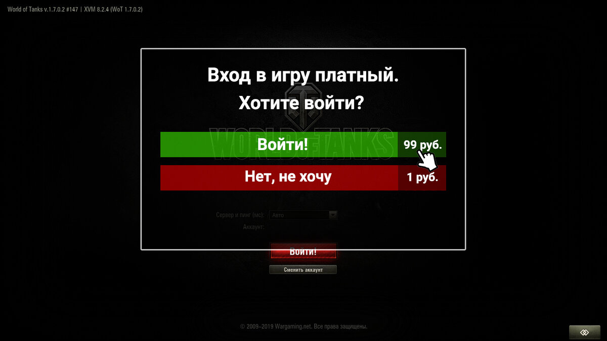 Всем привет! Некоторые игроки постоянно жалуются: "Все в игре у нас только за деньги, без доната играть совсем невозможно" - говорят они. Поэтому, наслушавшись их, сегодня я сделал юмористическую публикацию: «Каким будет WoT через несколько лет?». И да, все в этой публикации шуточное и не соответствует действительности! Все дополнительные элементы сделаны в фотошопе и не являются правдой. World of Tanks — бесплатная игра! 1 января, 20xx год. Заходите вы как-то после праздника в игру и видите новое нежданное обновление. С этого дня все в игре поменялось. Случилось то, чего боялись все игроки — игра стала полностью платной. "Ну ладно, может я просто преувеличиваю" - с такими мыслями игрок нажимает кнопку «Войти» и видит перед собой первое окно: Блин, ну а что еще делать... Играть то хочется. Да и всего лишь 99 рублей заплатить, не все так плохо, как оказалось! Ура, вошел! Но далее поджидают еще неожиданности. Когда хочу пополнить снаряжения своего танка, вижу, что все они теперь за наст
