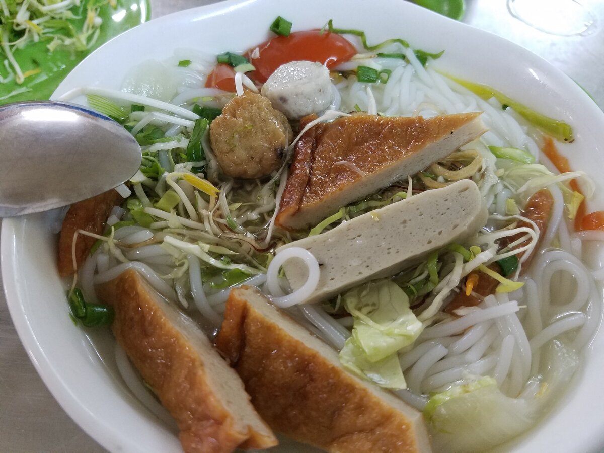 В этом блюде рисовая лапша, кусочки рыбы типа тунца, и четыре вида какой-то колбасы из рыбы. Такая колбаса хорошего качества доходит до 1 200 российских рублей за 1 кг. Соусы, трава, перец и лайм входят в стоимость. И бесплатно ещё что-то типа травяного чая со льдом. Сейчас это стоит 35 000 тысяч vnd, было еще недавно 30 000. При этом мне до этого традиционного вьетнамского места приходится ходить за супругой 1+ км до этого места. Это значит очень низкие столы и стулья. Не каждый сможет встать после трапезы сразу. При этом конечно мы знаем места с таким блюдом и ближе, и с нормальными столами и стульями. Но супруга говорит:" Это не то!" В принципе, я с ней согласен, вижу же где и сколько человек сидит. Так что и у вьетнамцев разные вкусы. Ниже можно посмотреть моё видео про это кафе: