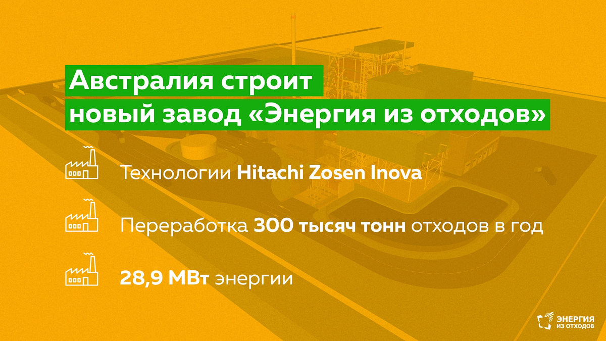 В 2018-м в стране открыли второй по величине завод «Энергия из отходов» — и в этом же году австралийцы столкнулись с кризисом, когда отходы больше нельзя было экспортировать. Двух заводов по переработке стало мало, и Австралия объявила о строительстве еще 7 предприятий. Среди них проект Hitachi Zosen Inova — завод East Rockingham вблизи города Перт. Кстати, Россия тоже сотрудничает с Hitachi, по такой же технологии строят заводы в Подмосковье и Татарстане.