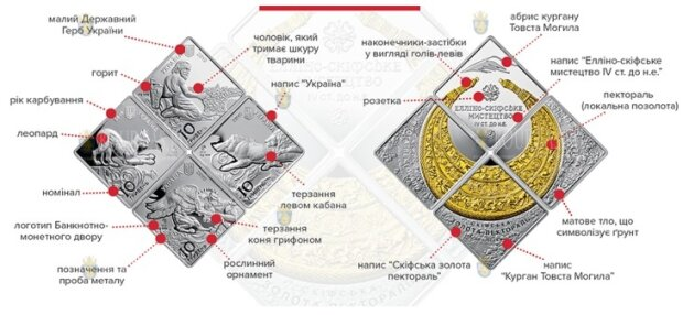 МБУ удивил необычным решением. В России монеты круглые, в Китае – с отверстием по центру, а вот Нацбанк Украины решил выпустить монеты квадратной формы, сообщает пресс-служба НБУ. Кроме того, финансисты сделали их из серебра 999 пробы, этакие «серебряники». Всего было изготовлено 4 разновидности квадратных монет, которые похожи на своеобразный конструктор: из них можно собрать изображение скифской пекторали – это нагрудное украшение скифского царя. Вот только оно было выполнено не из серебра, а из золота. Хотя, кто знает, может и до этого материала финансисты доберутся в будущем. Номинал монет – 10 гривен (чуть больше 26 руб.), однако стоят они гораздо дороже – 1 153 гривен (более 3 тыс. руб.). То есть, чтобы собрать скифскую пектораль придется потратить 5 612 гривен (более 14,5 тыс. руб.). Партия будет состоять из 4 тысяч «серебряников», в каждом комплекте будут идти четыре монеты. Продажи начнутся в конце этого – начале следующего месяца. В обращение деньги не поступят, однако колле