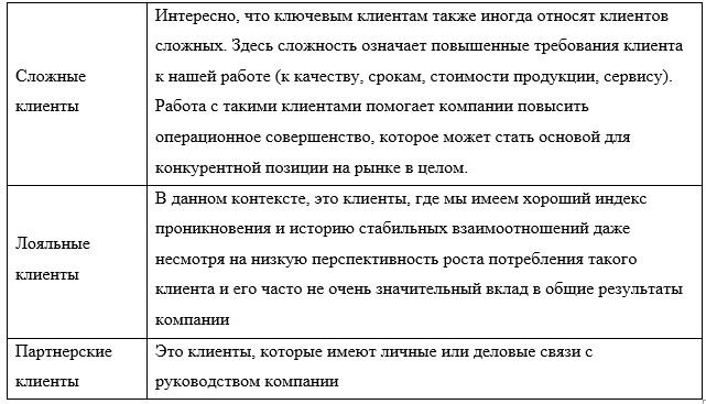 Несмотря на отраслевые различия корпоративных рынков, существует более или менее устоявшийся набор критериев для отнесения клиента к категории ключевых на уровне компании. Таким образом, ключевым можно считать клиента, который подпадает под один или несколько из следующих критериев, приведенных в таблице ниже.