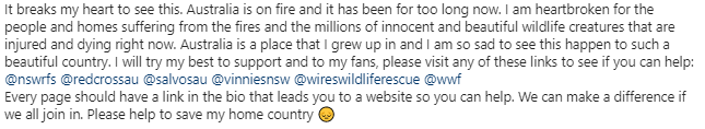 Австралия это место, где я выросла и мне очень грустно видеть то, что происходит с этой красивой страной. Я сделаю всё возможное, чтобы поддержать своих фанатов, пожалуйста, просмотрите эти ссылки и узнайте чем вы можете помочь: