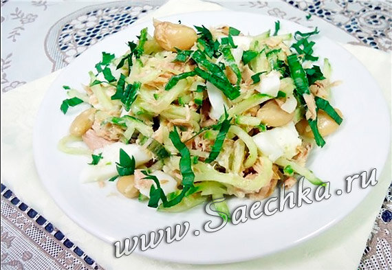 Яйца, сельдь, лук, огурец и яблоко мелко нарезать и смешать с вареной фасолью.