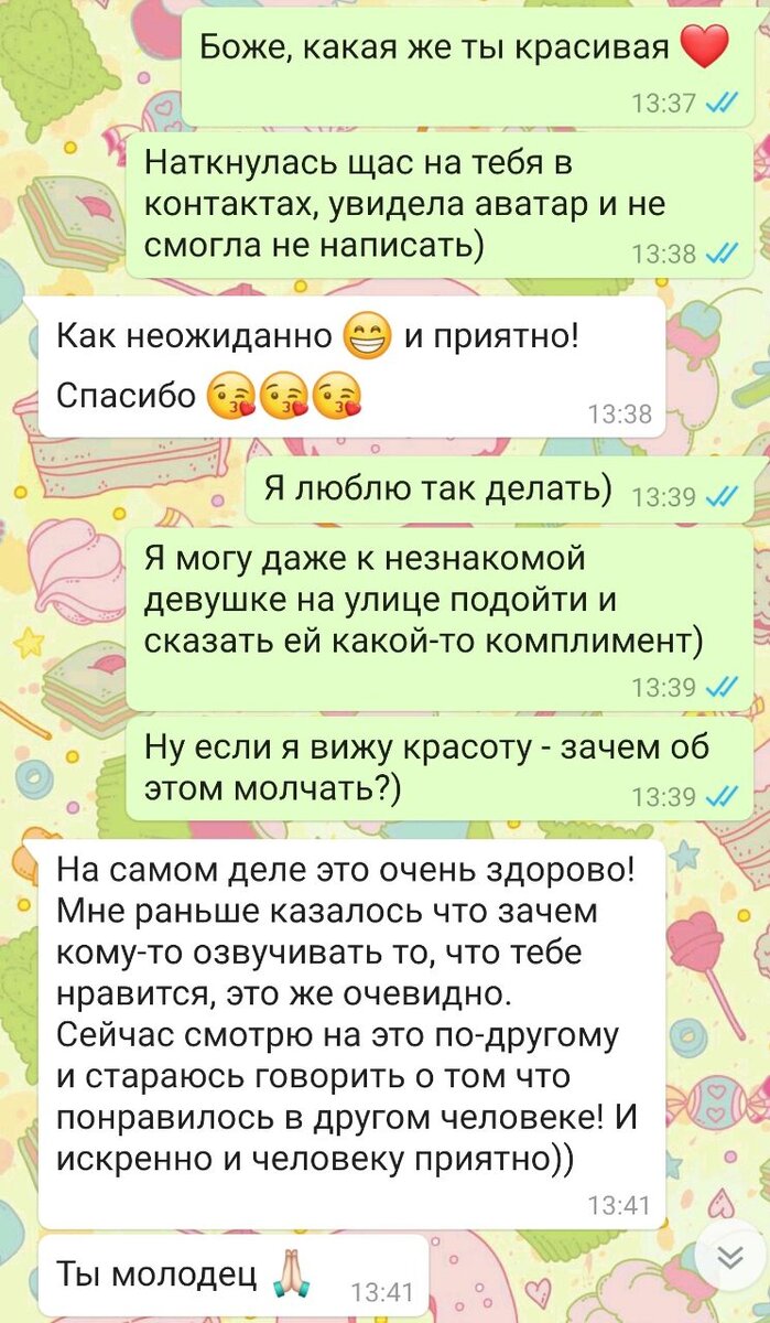Вот, просто написала знакомой. И на улицах подхожу к красивым девушкам и говорю им либо об их красоте, либо о прическе или одежде. Я считаю, это нормально - говорить людям приятные вещи. Более того, это важно и нужно! Делать приятные вещи - приятно вдвойне. И поднимает настроение - и говорящему, и тому, кому вы это сказали.