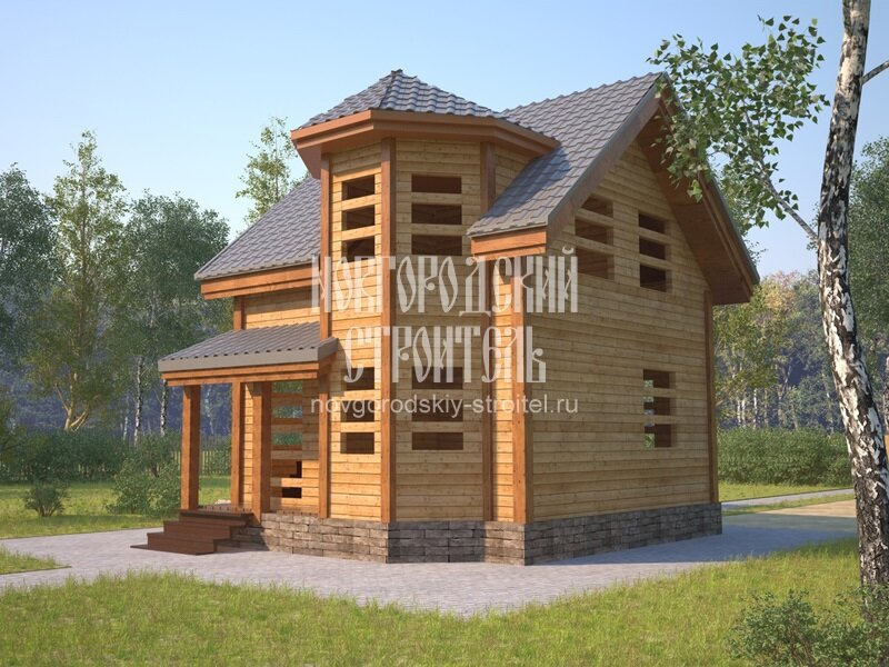 Часто основным преимуществом дачных и просто загородных домов считается предельная простота конструкции. Владельцы ошибочно полагают, что прямоугольная коробка – оптимальный вариант и в плане строительства, и в плане эксплуатации. Но это не совсем так, ведь для опытных строителей нашей компании некоторое усложнение конструкции не проблема, а дом при этом выглядит гораздо интереснее, да и жить в нем приятнее. Площадь застройки: 7х6 метров Общая площадь помещений: 80 м.кв. Этажность: 1,5 Количество санузлов: один Котельная: не предусмотрена Входные проёмы: угловое крыльцо 2,5х1 м Количество спален: две Гостиная и кухня: отдельные помещения, могут быть объединены арочным проемом Количество окон: 12 «Изюминка» этого проекта – эркер, проходящий через первый этаж и мансарду. Увенчивающая его шатровая крыша логично дополняет обычную двускатную крышу основной части строения, причем врезка в скат идет как под двум задним скатам шатра, так и по боковым стенам эркера. Благодаря тому, что потолок