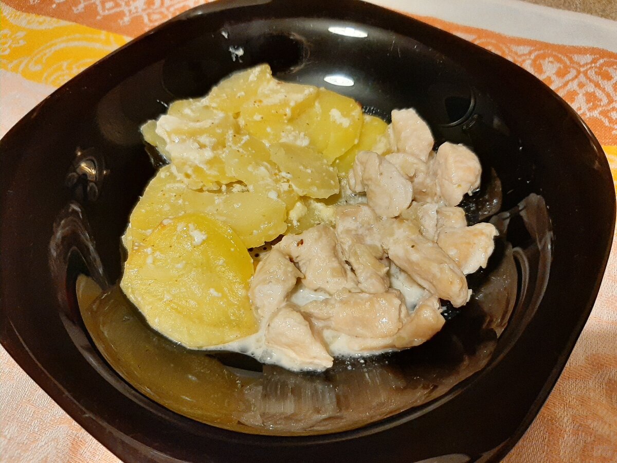 Рецепт достаточно простой, но получается очень вкусно. Готовим картофель Ингредиенты: Картофель Соль Перец Майонез Нарезаем круглешками картофель, солим, перчим и обмазываем майонезом. Можно добавить каких-нибудь приправ. Перекладываем в пакет для запекания. И в духовку на 180 градусов минут 40. Готовим курицу Ингредиенты: Куриное филе Соль Перец Чеснок Приправы Соевый соус Майонез Лук Нарезаем курочку небольшими кусочками. Солим, перчим, добавляем все специи. Соевый соус и майонез. Натираем зубчик чеснока и оставляем всё это мариноваться минут на 20-30. Этим временем обжариваем мелко нарезанный лук. Выкладываем на сковороду и обжариваем минут 7. Далее добавляем водичку, разбавленную сметаной или майонезом. Тушим минут 30. До готовности. Вот и всё! Приятного аппетита!