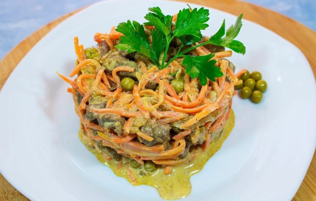 Если вы любите куриную печень и хотите попробовать что-то легкое и вкусное - рекомендую рецепт салата, который точно не оставит вам равнодушным. Готовится он из простых доступных ингредиентов, которые можно наверняка найти в закромах у каждой хозяйки и не требует много времени и усилий. Список необходимых ингредиентов очень прост: Как приготовить? Очень просто: Для начала тщательно промываем печень и отвариваем ее в подсоленной воде ориентировочно минут 15-20. Когда она будет готова - даем печени остыть и нарезаем ее соломкой. Маринованные или соленые ( кто как больше любит) огурцы тоже режем тонко соломкой. Лук нарезаем тонкими полукольцами, очищенную морковь натираем на крупной терке. Обжариваем на растительном масле лук до золотистого цвета, после добавляем морковь и тоже все вместе прожариваем. Даем готовой зажарке полностью остыть. Соединяем в глубокой миске порезанную соломкой печень, огурцы, горошек, выкладываем остывшую зажарку. Приправляем по вкусу солью и свежемолотым черным