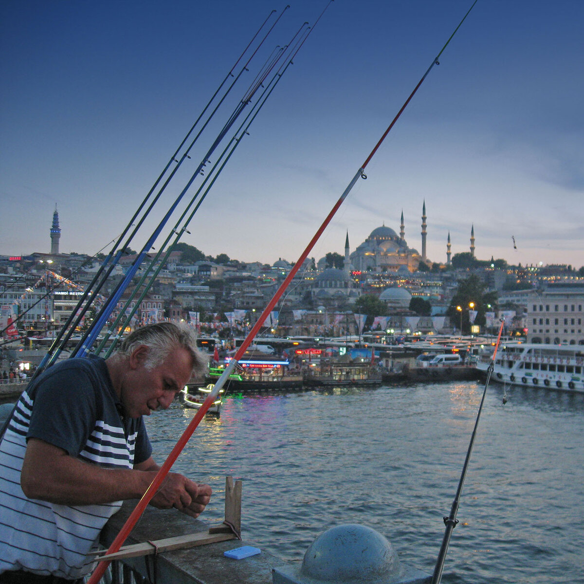 Особый (и бесплатный) аттракцион — вечерняя прогулка по Галатскому мосту в Бейоглу. С европейского берега то и дело отплывают прогулочные кораблики с туристами и довольно большие паромы, перевозящие местных в Азию — домой с работы. На мосту всегда есть рыбаки, но вечером их особенно много. Ловят и зачастую тут же продают за гроши разную мелкую рыбешку. Похоже, рыбачат и девушки — я видел одну.
