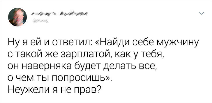 Мужчины-пользователи признавались, что и вовсе зарабатывают меньше своих жен. Девушки же сообщали, что переживать по этому поводу не стоит и главное в муже не его кошелек, а его забота.