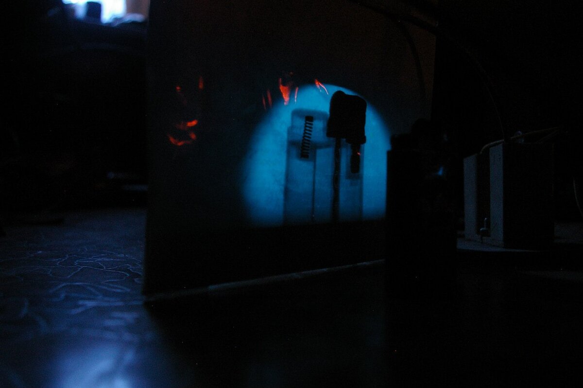 В дальнейшем я взял кусок картона, посыпал на него тонким слоем люминофор, закрепил полосками скотча, получив простейший экран. Разместив перед экраном различные предметы, удалось их просветить насквозь и получить достаточно четкое изображение на экране.