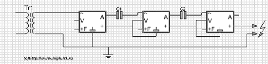 Для возможности их последовательного подключения два умножителя пришлось обработать ножовкой, найдя так называемый «выход А», и через конденсатор 30кВ 470Пф подключить его ко входу следующего умножителя.
