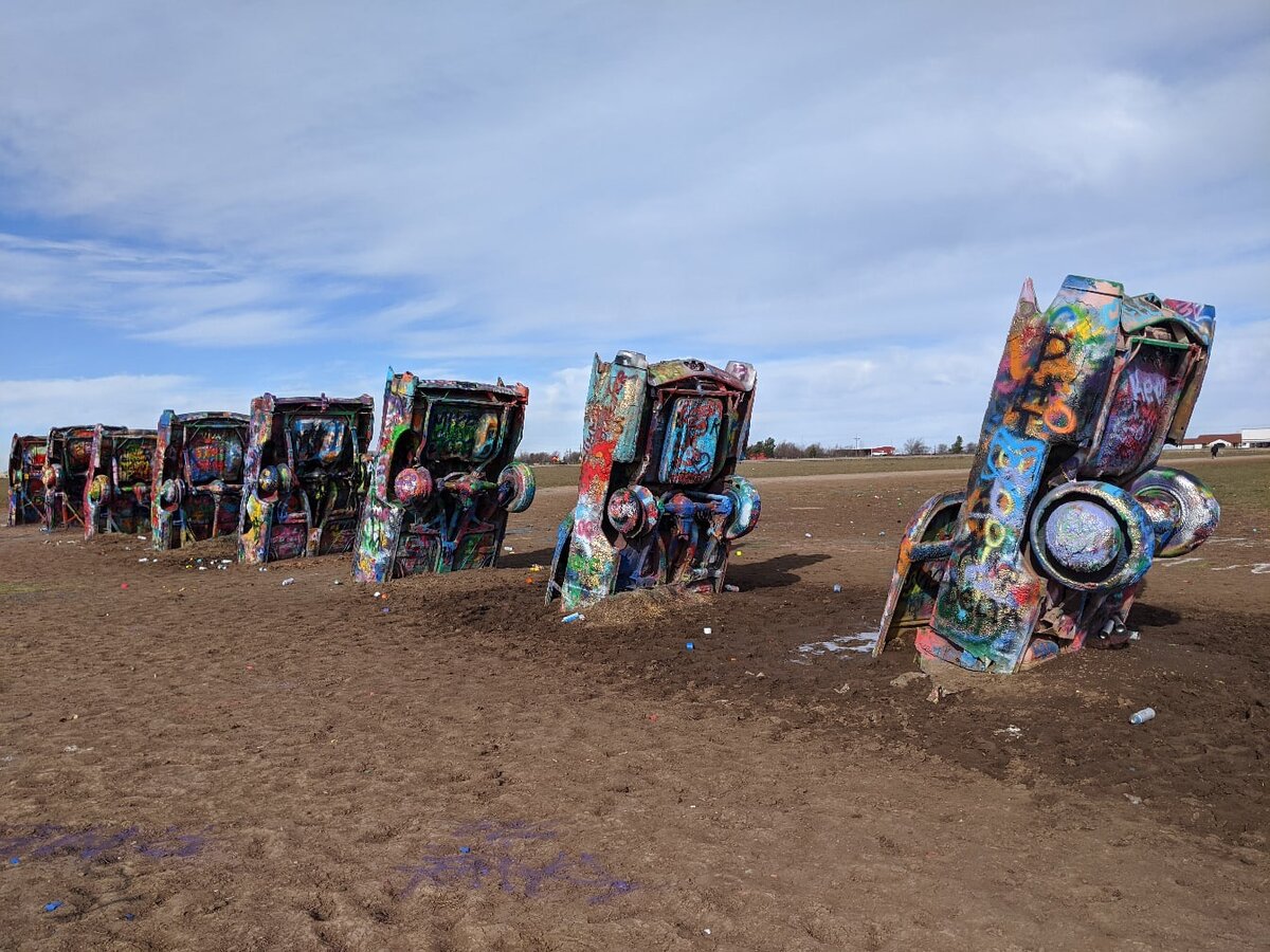 Cadillac Ranch На поле,вдоль исторической дороги 66 в городе Амарилло, штат Техас расположилась такая вот инсталляция . Пишут что в 74 году миллионер проспонсировал арт проект группы хиппи-художников из Сан Франциско. В других источниках пишут,что он заказал арт-проект ,чтоб удивить всех. Получилось ,что получилось ) в 97 году объект был перенесен на 3 км ,подальше от города. Людям судя по всему нравится,приходят,раскрашивают баллончиками,на машинах уже наверное тысяча слоев,самое печально,что поле усеяно пустыми баллончиками и по нему скачут крышки от них,вместо перекати-поле :( помойка какая-то прям,хотя и есть знак с просьбой убирать за собой . Вторая часть фотографий сувенирный магазин недалеко от Cadillac ranch