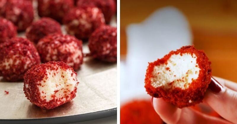 Красный бархат является одним из самых популярных десертов, и не случайно! Нежное и такое удачное сочетание вкуснейшего сливочного крема с мягким красочным бисквитом может привести в восторг любого человека, даже того, кто не очень любит десерты. Попробуйте приготовить красный бархат по-новому — это замечательный десерт «на один укус», который станет хитом вашего вечера! Для красного бисквита приготовьте маффины из следующих ингредиентов (кол-во на 12 шт): Крем для десерта состоит из следующих ингредиентов: Приступаем к приготовлению: 1. Ингредиенты для крема смешать и немного взбить миксером до небольшой пышности. Затем выложить на противень небольшие порции в форме шариков и отправить в морозилку на час. 2. Соединяем все сухие ингредиенты для маффинов, тщательно перемешиваем. Добавляем растительное масло, сливочное масло комнатной температуры, а также яичные желтки, взбиваем миксером. Постепенно вливаем кефир, уксус и краситель. Взбиваем белки в пики, аккуратно вмешиваем в тесто. Вы