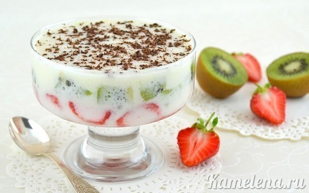 Фрукты в зефирном креме Нежный, кисло-сладкий десерт. Ингредиенты: - 2 зефира (по 70 гр) - 200 гр сливок 10%-20% - 200 гр клубники - 200 гр киви - шоколад Зефир поломать на кусочки, положить в блендер, влить сливки. Тщательно взбить до однородной массы. Клубнику порезать на четвертинки (если крупная – то порезать мельче). Киви почистить, порезать кубиками. В креманку или чашку выложить клубнику в один слой. Полить кремом так, чтобы полностью покрыть клубнику. Сверху выложить киви в один слой. Полить кремом, полностью закрыв киви. Посыпать натертым на терке шоколадом. Десерт можно сразу подавать, а можно поставить на час в холодильник для охлаждения. Будет вкусно в любом случае