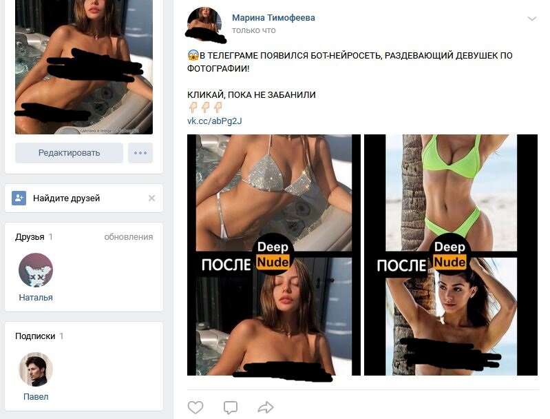 Вечная тема, вечный трафик. Покупаем или регистрируем автореги , вешаем на стену рекламный пост с текстом «ПОЯВИЛСЯ ТЕЛЕГРАМ-БОТ, КОТОРЫЙ РАЗДЕВАЕТ ДЕВУШЕК ПО ФОТОГРАФИИ! ПЕРЕХОДИ И УБЕДИСЬ САМ, ПОКА НЕ ЗАБЛОКИРОВАЛИ: *ваша реферальная ссылка* (СОКРАТИТЬ, К ПРИМЕРУ НА vk.cc). Креативы и фотографии для поста будут дальше в схеме. На аватарку лепим голую мадам (чтобы сами не удержались и кликнули, увидя ее в комментариях). Вот вам 100 пабликов-миллионников с открытыми комментами: https://yadi.sk/i/DNOvPdakutiSzg