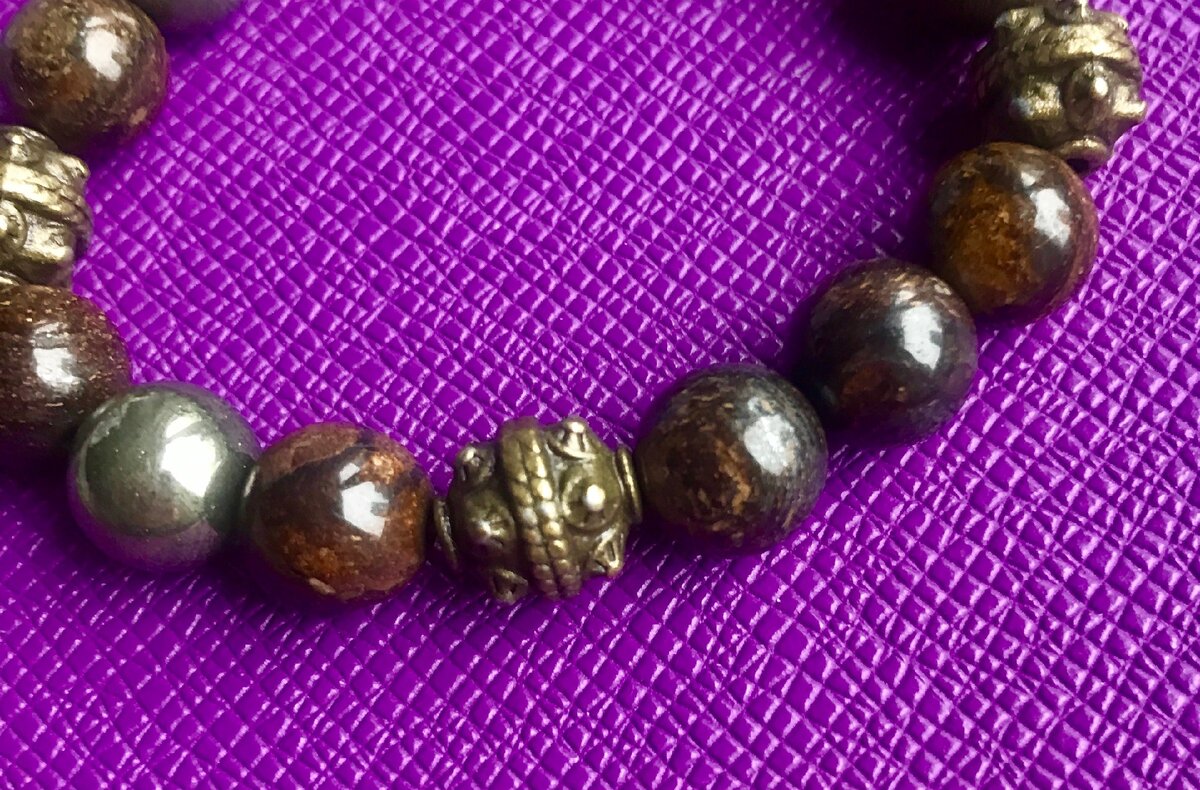 На первый взгляд этот камень ничем не примечателен. Он выглядит темным, скромным, всего лишь фон для других камней, уж точно не центр внимания! Но вот на него падает свет - и начинается преображение. Его цвет оказывается насыщенным, как цвет свежеобжаренных кофейных зерен. Его поверхность таит переливы блеска на мелких, похожих на чешуйки гранях. В нем то и дело попадаются светлые вкрапления, тонкие, еле заметные. Все это - про бронзит, аристократичную красоту которого легко упустить, но, признав, нельзя ни с чем перепутать. Название непрозрачно намекает на сходство с бронзой: цвет, да еще металлический блеск. При этом к бронзе как таковой камень-тезка не имеет прямого отношения, зато в его составе хватает железа. Из-за этого бронзит тяжелее многих других минералов, хотя в его случае это не так очевидно, как у гематита. Бронзит - достаточно твердый камень, яшме он уступает, но не сильно, и показатель до 6 единиц по Моосу - это хорошо. По этой характеристике он подходит для украшений,