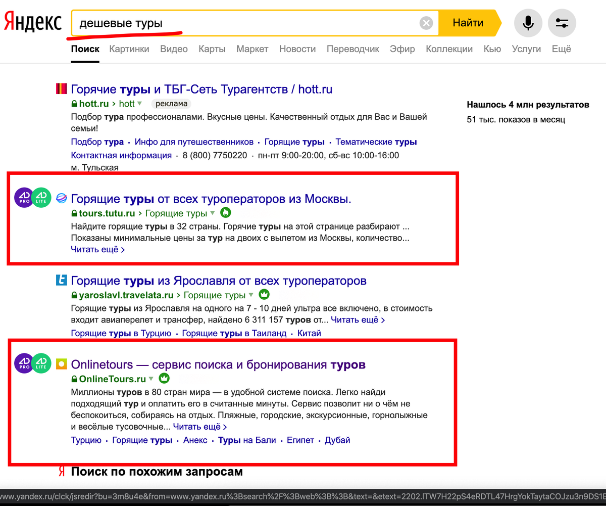и еще сразу просьба, поставь лайк и напиши комментарий очень тебя прошу, дюже очень прошу:) 🙏 Я уверен что для тебя не новость что люди часто отдыхают за границей и имеют склонность искать предложения подешевле. Не будем углубляться сильно в детали, их там хватает. Даже первичные данные показывают что отдыхающие за границей есть и они хотят отдохнуть подешевле - примем этот факт как данность:) Ищем горящие туры за которые нам заплатят. Надеюсь ты уже зарегистрировался по моей партнерской ссылке, ты же не против если я заработаю на том что пишу эти статьи? Не против!!? Отлично, тогда начнем поиск. Переходим в яндекс поиск (через браузер Chrome c установленным расширением) вводим в поисковую строку запрос "дешевые туры" и видим аж 2 сайта с возмо