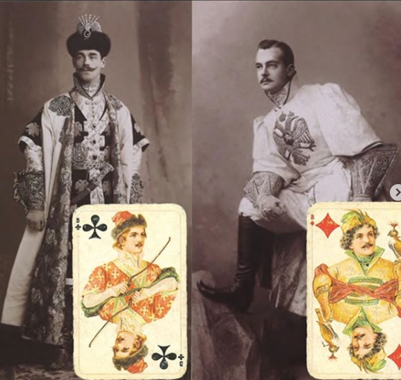 В феврале 1903 г. состоялся костюмированный бал. Основным требованием к приглашенным было явиться в костюмах эпохи первых Романовых. Смотрите мой пост об этом событие ранее. Отшивали костюмы лучшие портные Российской империи. Все участники бала были отфоторафированы и это стало причиной создания их образов в игральных картах.