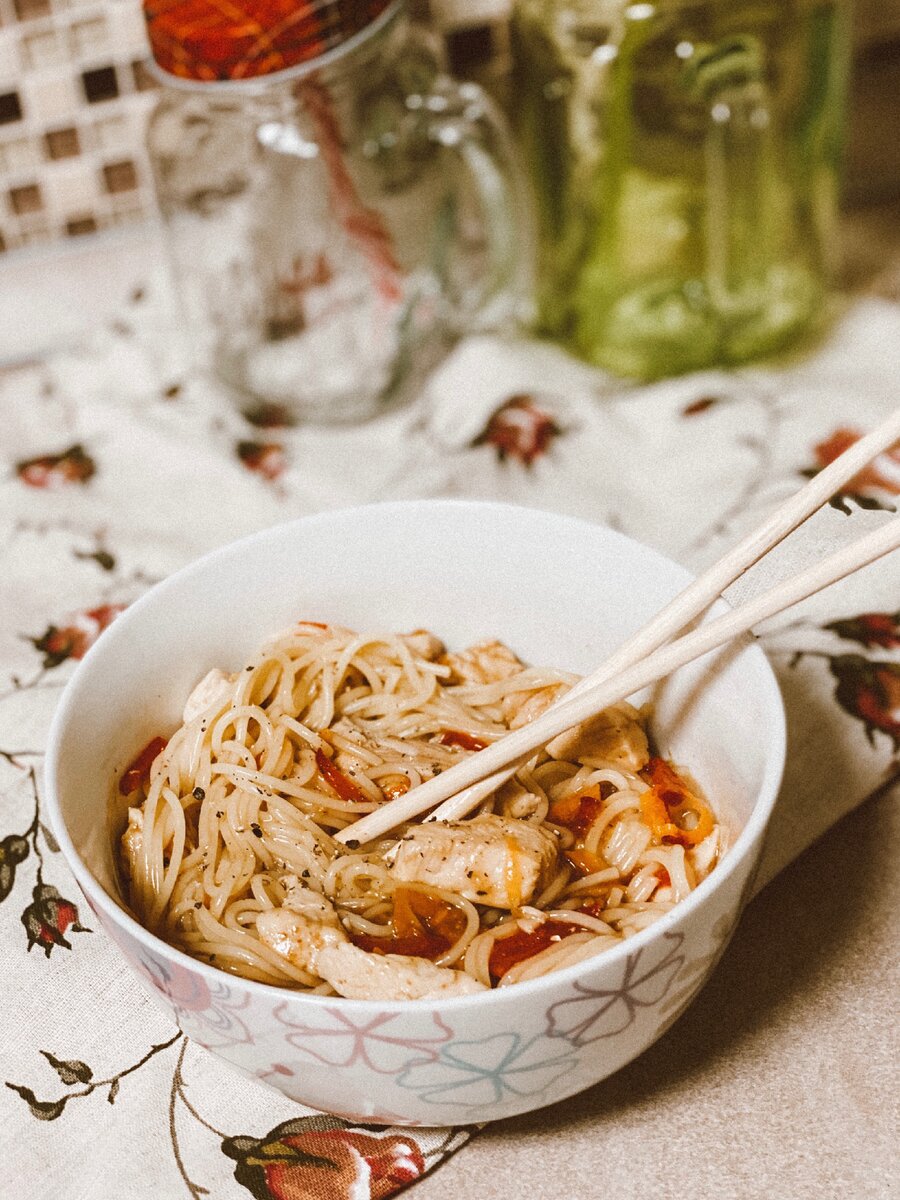Куриную грудку обжариваем на сухой сковороде. Как только обжарится со всех сторон, добавляем соус терияки, закрываем крышкой и оставляем томиться на маленьком огне в течение 15 минут.