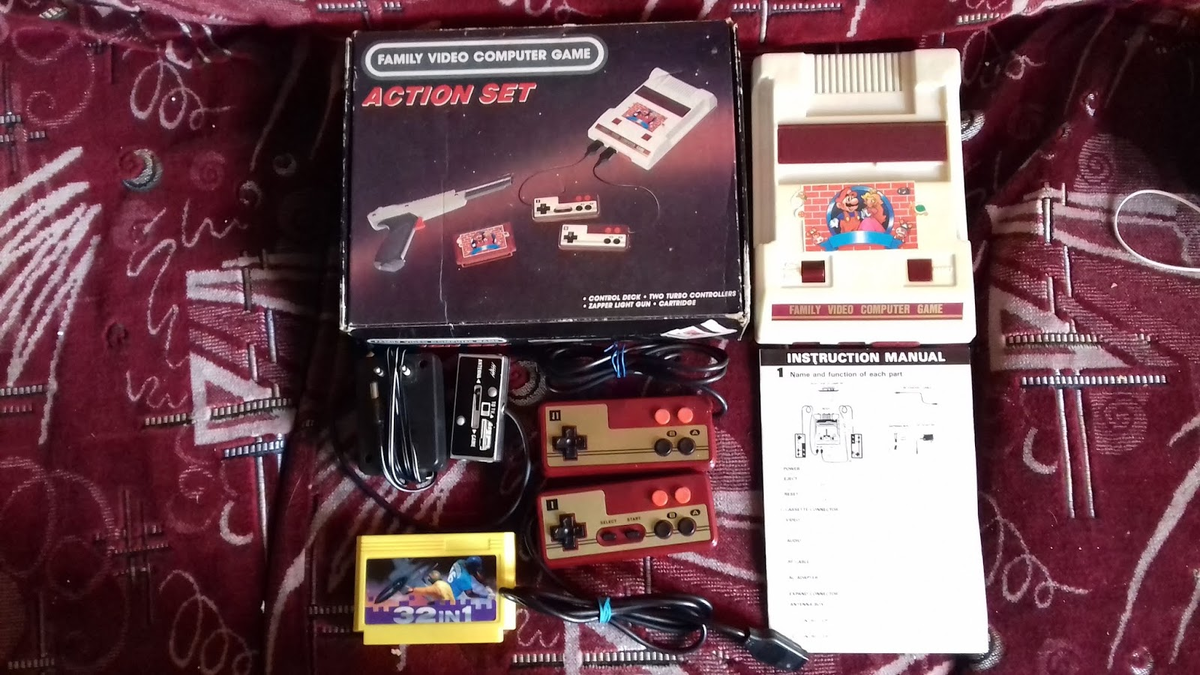 Всем привет. Сегодня я расскажу вам про одно из последних пополнений в своей коллекции ретро-консолей. Приставка называется "Family Video Computer Game Action Set", я приобрёл её весной 2019 года в Санкт-Петербурге за 1000 рублей, причём в практически полном комплекте. Данная приставка была произведена неизвестной компанией скорее всего в Китае. Продавалась она на территории разных стран, её следы встречаются в Аргентине, Испании и Греции. Продавалась ли она на постсоветском пространстве – доподлинно не известно. Человек, у которого я её приобрел, рассказал мне, что её привезли ему по военной линии из Германии в самом начале 90-х. Тогда он получил целую партию таких приставок в размере около 100 штук, и все они были с дефектом – не работал звук. Он лично ремонтировал эти консоли, затем они отправлялись на перепродажу, причём некоторые образцы кустарным способом переделывались в SECAM для использования с цветными советскими телевизорами. История звучит правдоподобно, учитывая то, что ч
