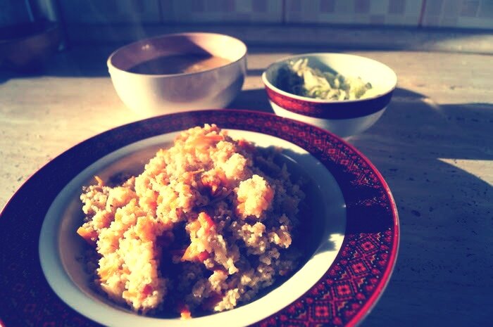 Доброго времени суток друзья. Сегодня посмотрим что можно приготовить себе на обед имея в кармане всего 10 рублей. Начнем приготовление) Сегодня будем варить ( суп пюре из картошки с луком), (ячневая крупа с зажаркой) и ( салат из редьки). Для этого нам понадобится : 1-ое . Картофель 1 шт . Морковь 1/4 . Лук 3/4 . Соль, перец . Вода 300мл 2-ое . Ячневая крупа 100г . Морковь 3/4 . Лук 1/4 . Соль, перец . Вода 300мл Салат . Редька зеленая 100г . Соль, перец Ну что приступаем готовить! Лук ложим в духовку и запекаем при температуре 200 градусов до появления золотистой корочки. Нарезаем мелко морковь и картофель и варим до размягчения. Когда лук запекется достаем и отправляем вариться с овощами. Солим, перчим и все это измельчаем любыми способами, удобней блендером. Ячневую кашу заливаем водой и ставим на средний огонь. Лук мелко нарезаем, а морковь натераем на терке. Отправляем на пережарку добавляя бульон или воду. Когда зажарка приготовится добавляем туда кашу, долить немного в