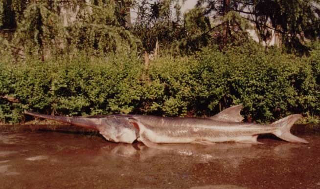 Псефур, китайский веслонос Psephurus gladius (Martens, 1862) Страна: Китай Место: река Янцзы. Официально признан вымершим в период 2005-2010 Одна из крупнейших пресноводных рыб, единственный представитель рода. В январе 2020 года официально признан МСОП вымершим в период 2005-2010 гг. Вид Psephurus gladius был впервые описан немецким зоологом Эдуардом фон Мартенсом в 1862 году под именем Polyodon gladius, в 1873 году другой немецкий зоолог Альберт Гюнтер выделил его в отдельный род Psephurus. Китайский веслонос, вероятно, является крупнейшей пресноводной рыбой. Длина его тела может превышать три метра, масса тела — триста килограммов. Имеется информация, что псефур может достигать длины 7 метров и весить около полтонны, но документальных подтверждений этому нет. Рыба имеет вытянутое тело с тёмно-серой спиной и белой брюшной областью. Чешуя практически отсутствует. От четверти до трети длины псефура составляет длинный вырост верхней челюсти, на котором находятся специальные рецепторы, п