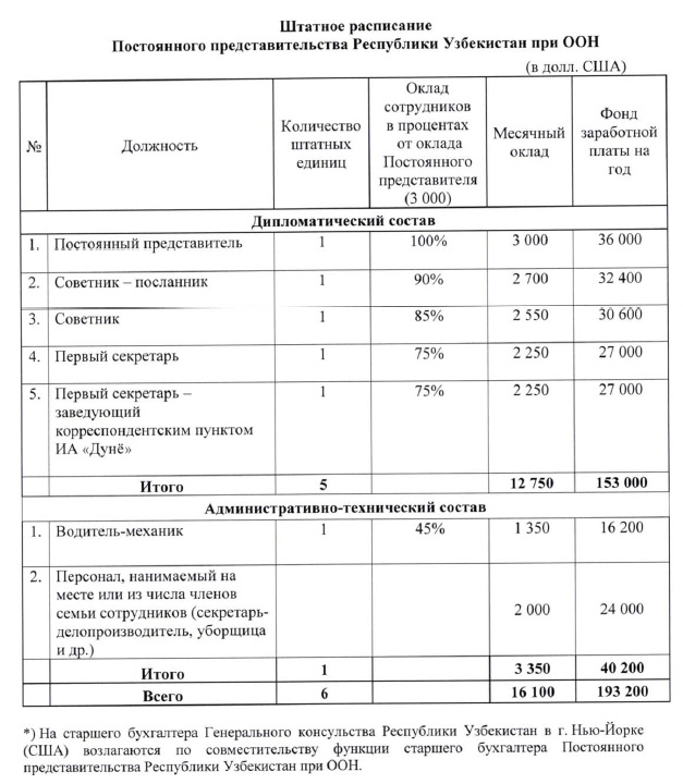 Самые большие месячные оклады у Постоянного представителя Узбекистана при ООН – 3 тысячи долларов и Генерального консула Узбекистана в Нью-Йорке – 2550 долларов.