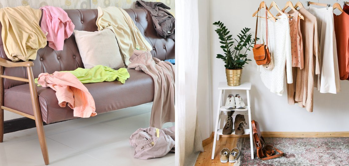 - Присмотритесь к открытым системам хранения для одежды. Они не перегрузят интерьер визуально и станут дополнительным стимулом держать одежду в идеальном порядке.