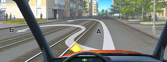 На данном участке дороги, при условии, что нет приближающихся трамваев, водитель легкового автомобиля намерен выполнить разворот. Вопрос. По какой траектории разрешено выполнить разворот? [Ответ в конце статьи] Теория п.8.5 ПДД Перед поворотом направо, налево или разворотом водитель обязан заблаговременно занять соответствующее крайнее положение на проезжей части, предназначенной для движения в данном направлении, кроме случаев, когда совершается поворот при въезде на перекресток, где организовано круговое движение. При наличии слева трамвайных путей попутного направления, расположенных на одном уровне с проезжей частью, поворот налево и разворот должны выполняться с них, если знаками 5.15.1 или 5.15.2 либо разметкой 1.18 не предписан иной порядок движения. При этом не должно создаваться помех трамваю. п.8.8 ПДД При повороте налево или развороте вне перекрестка водитель безрельсового транспортного средства обязан уступить дорогу встречным транспортным средствам и трамваю попутного напр