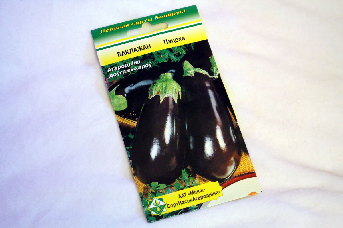 В прошлый раз я рассказывал, как я пополнил коллекцию 13 сортами томатов белорусской селекции и 5 сортами перцев. Ещё захотел добавить в свою коллекцию и белорусские сорта баклажанов, но оказалось это не просто. В магазине СортСемОвощ в Минске в наличии был только один сорт белорусской селекции – Пацеха (Потеха). Ещё точно существует в ассортименте этой компании белорусский сорт Кулон, но в наличии его не нашел. Пацеха (Потеха) Довольно старый и хорошо проверенный сорт баклажана. В госреестр Беларуси включен в 2007 году. Сорт создан в РУП «Институт овощеводства» (Самохваловичи, Беларусь). Родословная сорта точно известна - это не какой-нибудь культивар, сомнительного происхождения от мелких агрофирм. Сорт Пацеха был получен методом гибридизации Бегемот F1 x (Little x Moneymaker) c последующим индивидуальным отбором. Авторы сорта: Л.Мишин, Н.Юбко, Н.Купреенко. Характеристики Плоды в стадии технической спелости темно-фиолетовые. Мякоть зеленовато-белая. Массой около 200 грамм. Форма плод