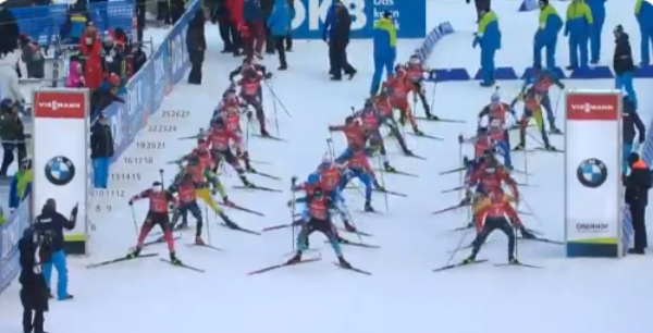 1. Халили, 2. Гараничев, 3. Поршнев, 4. Латыпов Да, первое место нам не светило. В отсутствии братьев Бё, фаворитами гонки считались французы. Кто бы мог подумать, что на первом же этапе быстрый парень Эмильен Жаклен уйдет на штрафной круг и в лидерами привычно стали норвежцы. На втором этапе белорусы на время вышли в лидеры. Стреляли братья-славяне отлично! Но Бочарникову не хватило сил по трассе. Наши шли четвертыми почти всю гонку. Халили отстрелялся с одним запасным, Гараничев с 1-м. Поршнев на второй стрельбе изрядно потрепал нервы и себе, и болельщикам, когда на два последних доп.патрона у него осталось две не