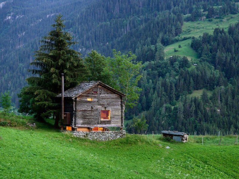 Это непримечательная хижина расположена прямо среди альпийских лесов, на одном из склонов. Хоть она и имеет довольно ветхий внешний вид, несмотря на это, в действительности «небольшой дом» оснащен всеми удобствами, которые требуются человеку и даже немного больше. Это один из тех случаев, когда выражение «не судите книгу по обложке» подойдет как нельзя кстати. Первое, что бросается в глаза, так это вид изнутри, который сильно контрастирует с картиной снаружи. Изнутри хижина кажется весьма теплой и уютной. Сам интерьер создан из дубовых панелей, что позволяет дому оставаться теплым даже в зимнее время года. В летние месяцы главной особенностью такого дома, остаются окна, которые расположены по всем стенам хижины и позволяют насладиться великолепными видами на окружающие горы и пейзажи. Что касается расположению комнат, то даже несмотря на свою небольшую площадь, дом в какой то степени кажется достаточно просторным. В нём имеется небольшая кухня, столовая и гостинная зона на первом эта
