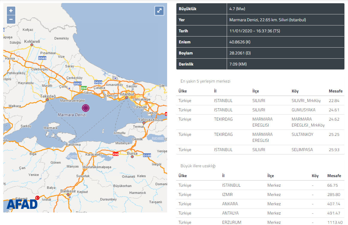 Son dakika deprem haberi İstanbul'dan geldi. İstanbul genelinde çok sayıda ilçede deprem hissedildi. İşte 4.7 şiddetinde ölçülen İstanbul depremi ile alakalı en yeni bilgiler... İstanbul'da deprem paniği! Pek çok ilçede vatandaşlar deprem esnasında kendilerini dışarı attı... Günün son dakika deprem haberi İstanbul'dan geldi. Peki deprem kaç şiddetinde ölçümlendi, hangi ilçelerde hissedildi, deprem yıkıma neden oldu mu? İşte İstanbul'da akşam saatlerinde meydana gelen depreme dair ilk bilgiler... Emlak Pencerem / Deprem Haberleri - 11 Ocak 2020 - İstanbul İstanbul genelinde akşam saatlerinde korkutan bir deprem meydana geldi. Konuyla ilgili AFAD tarafından açıklanan ilk bilgilere göre deprem 4.7 büyüklüğünde olduğu kaydedildi. Bu akşam saatlerinde İstanbul sallandı. Akşam saat 16:37 sıralarında merkez üssü Silivri olan bir deprem yaşandı. AFAD ve Kandilli son dakika geçtiği deprem bilgileri şöyle; T.C. İÇİŞLERİ BAKANLIĞI Afet ve Acil Durum Yönetimi Başkanlığı Deprem Dairesi Başkanlığı